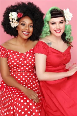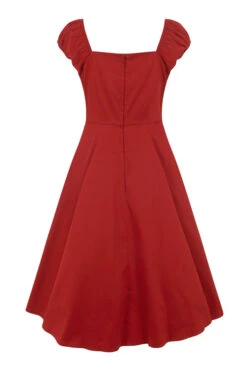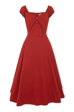 The Dolores Doll Classic Cotton is a 1950s inspired swing style dress. Coming in a stunning teal, she features a sweetheart neckline, and is gathered at the bust with two matching domed buttons! Her short elasticated puff sleeves can be worn either on, or off the shoulder. Her full swing skirt starts at the waist, falling to approximately just below the knee, and has handy side seam pockets for all those little essentials! She works well with one of our petticoats to give the skirt a fuller shape! She fastens with a zip running up the centre of her back.