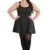 Her full swing skirt starts at the waist, is hemmed approximately below the knee, and has practical side seam pockets!