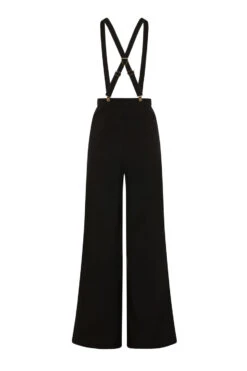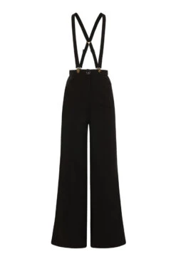 Her narrow suspender braces are made from matching fabric, adjust with metal slides, and attach to the trousers with metal braces clips in bronze. They are completely removable
