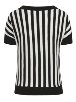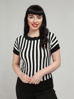 Make headlines with this gorgeous new piece! The Joy Beetle Stripe Knitted Top comes in a stretchy soft knit and features bold, vertical black and white stripes. She also features bands of horizontal black ribbing on her round neckline, the cuffs of her short grown-on sleeves, and on her hem, which falls approximately on the upper hip. Try pairing Joy with a simple swing skirt Like the Hell Bunny Gabby and black boots or heels for a stylish, modern look for day or night.