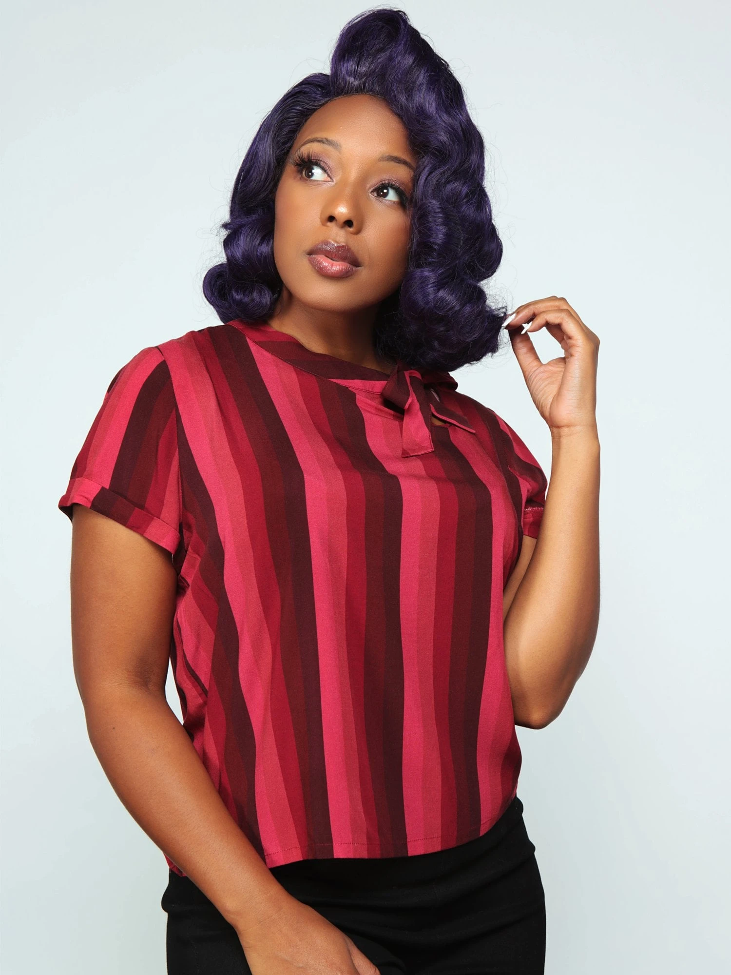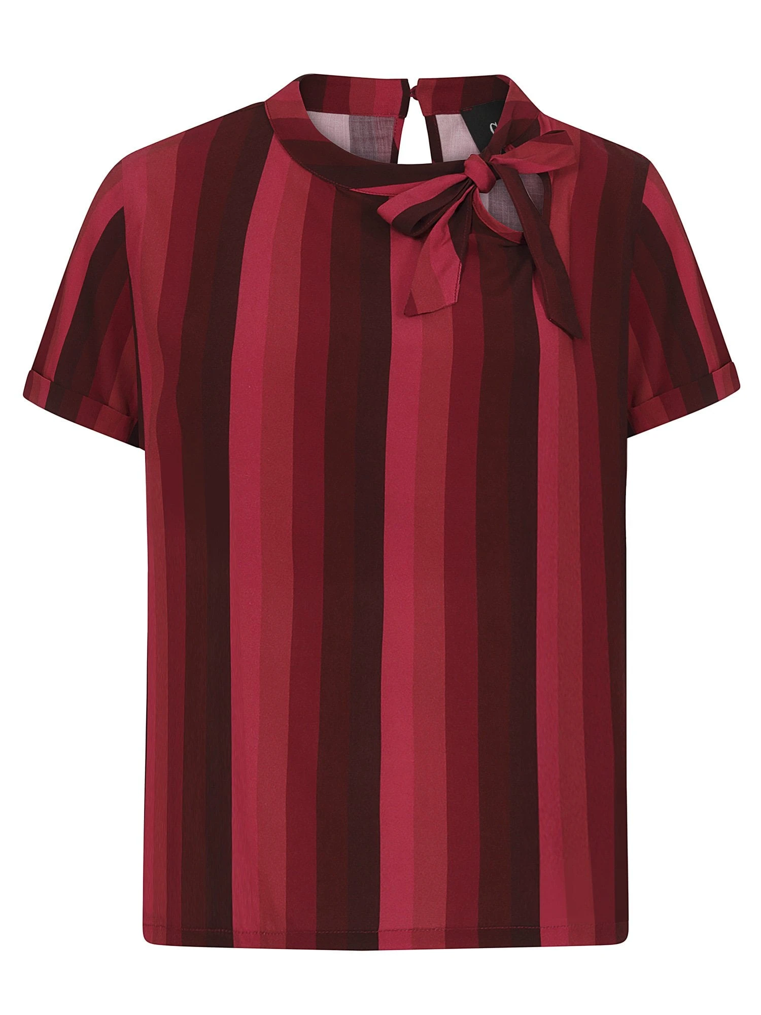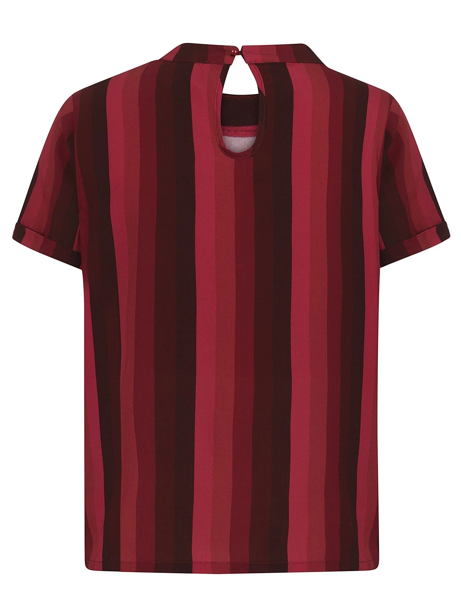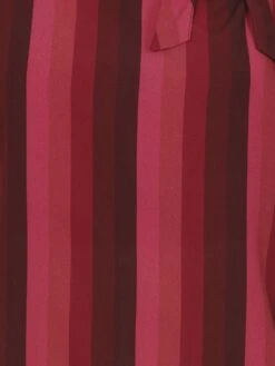 The Collectif Nicola midnight stripe top is definitely one to watch this season! Featuring stunning vertical stripes ranging from a deep burgundy to a soft, rose red, she comes in a beautifully wearable, drapey style and ends approximately at the upper hip, perfect for any occasion. Loose-fitting, but still highly flattering, Nicola has two graceful keyholes, one at the back of the neck and one off-centre on the front neckline, finishing in a pretty, matching bow at the neck.Â