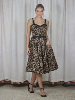 Her fitted bodice features a fabulous sweetheart neck with a black trim lining the edge, and adjustable spaghetti straps.