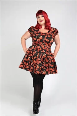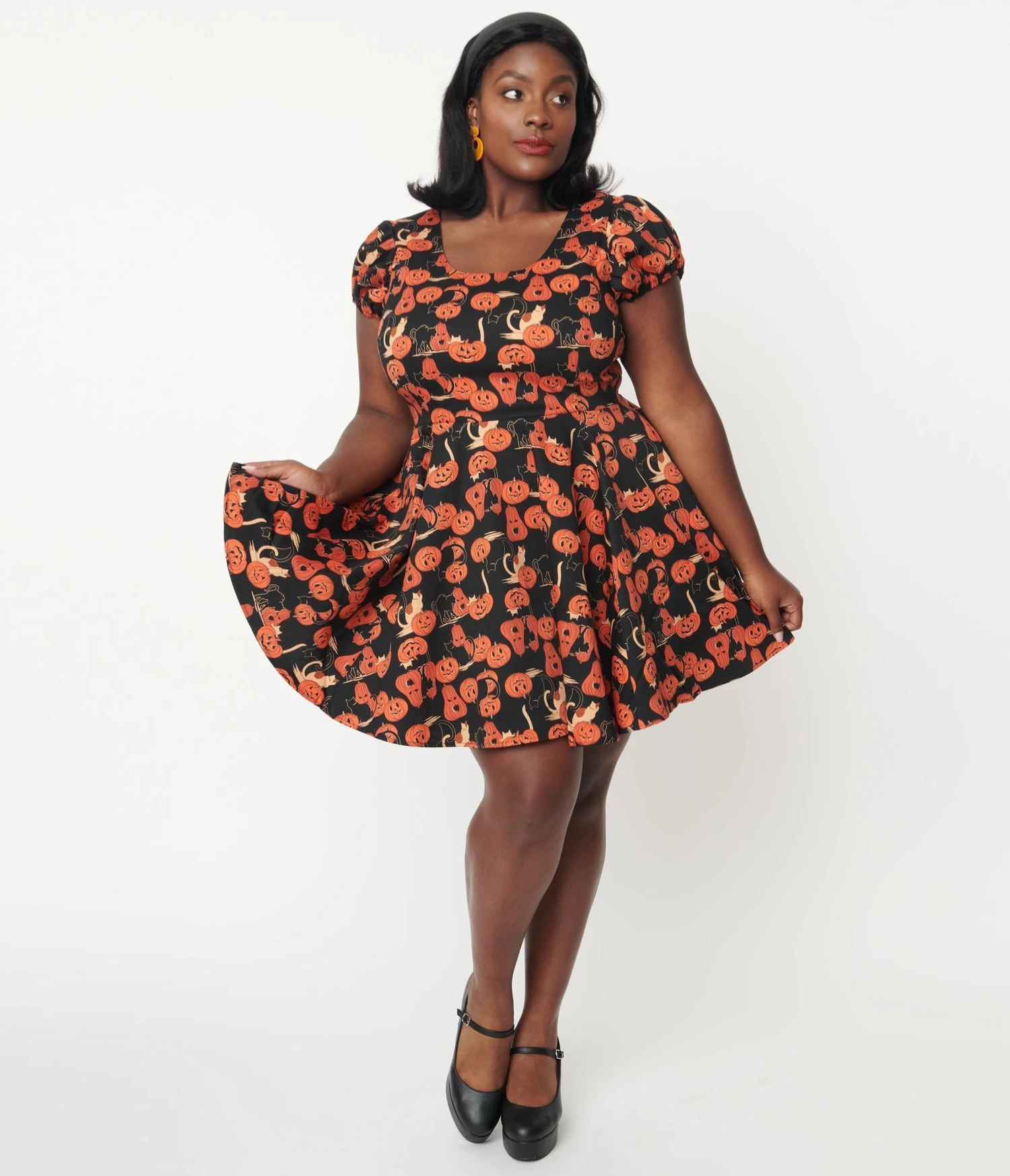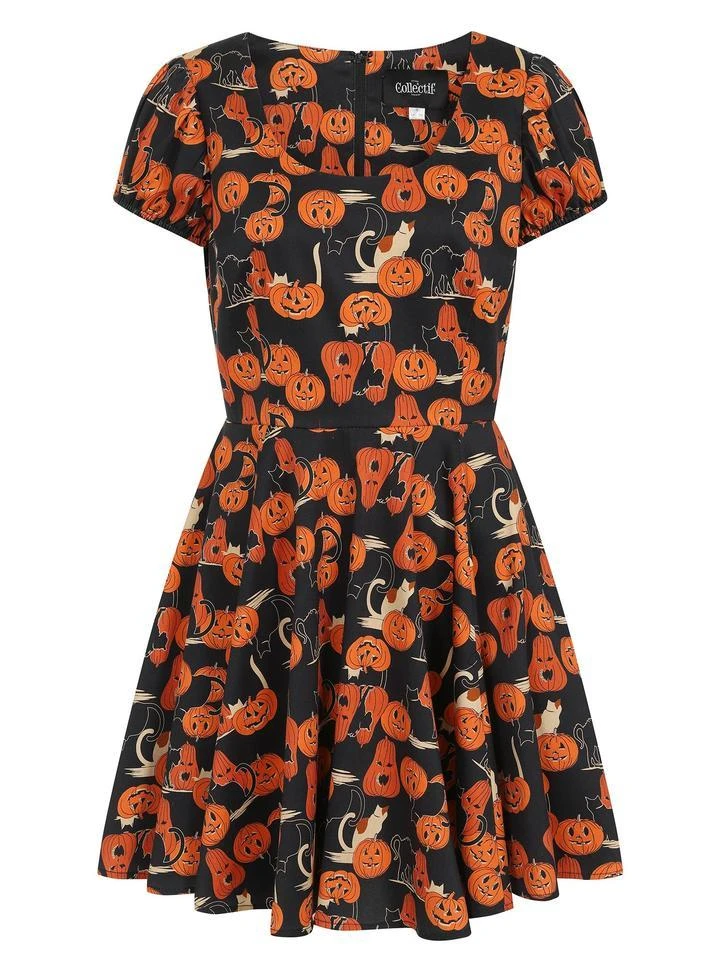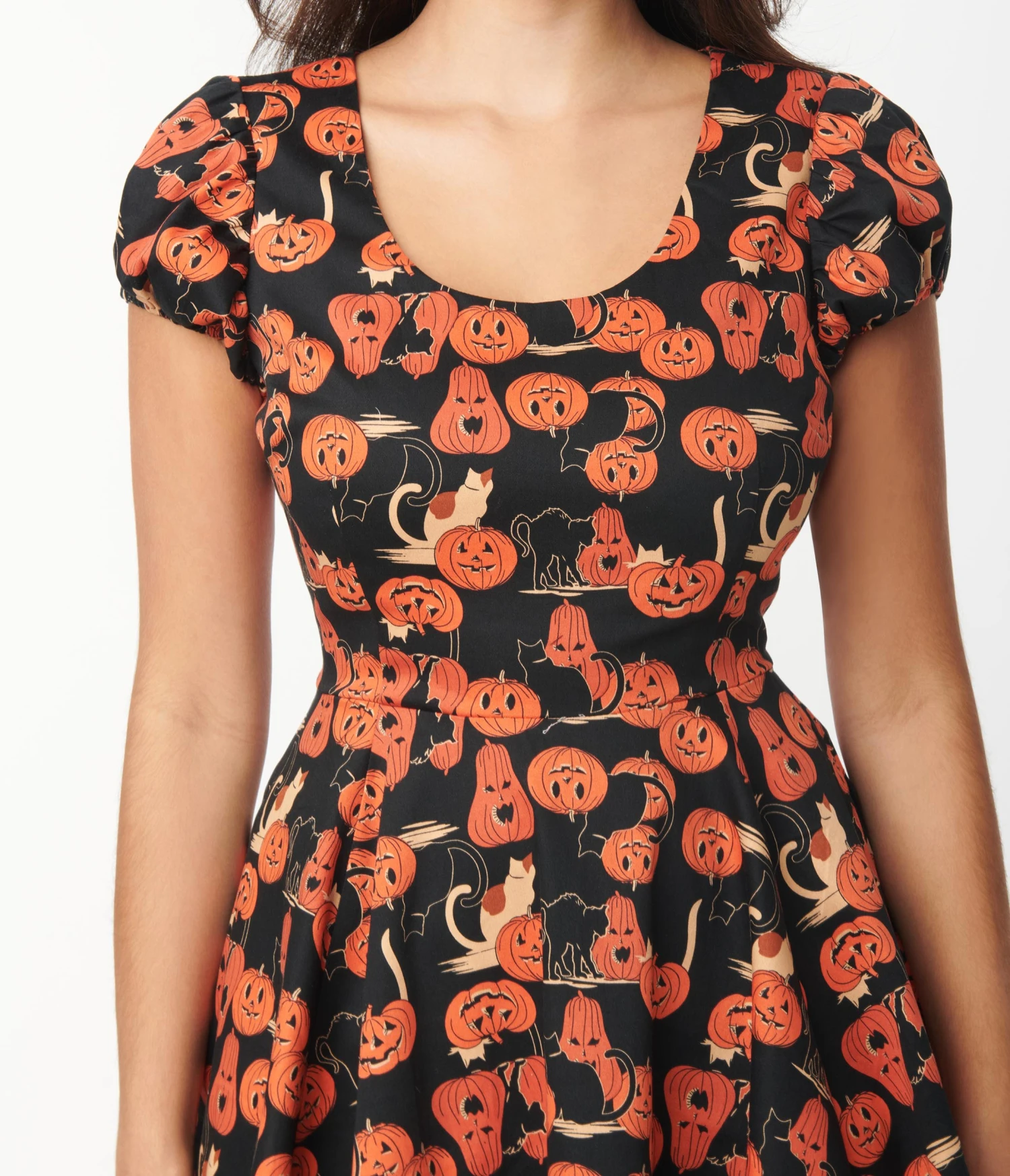 The cutest Halloween dress is here with a Jack O’ Lantern and kitty print on a black background.