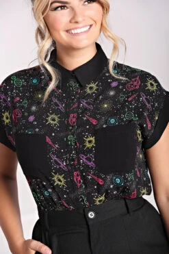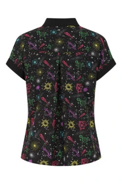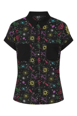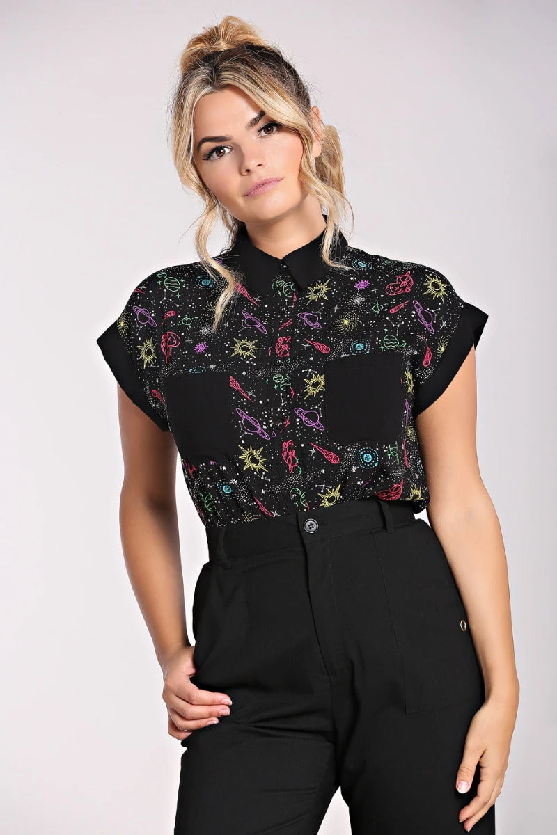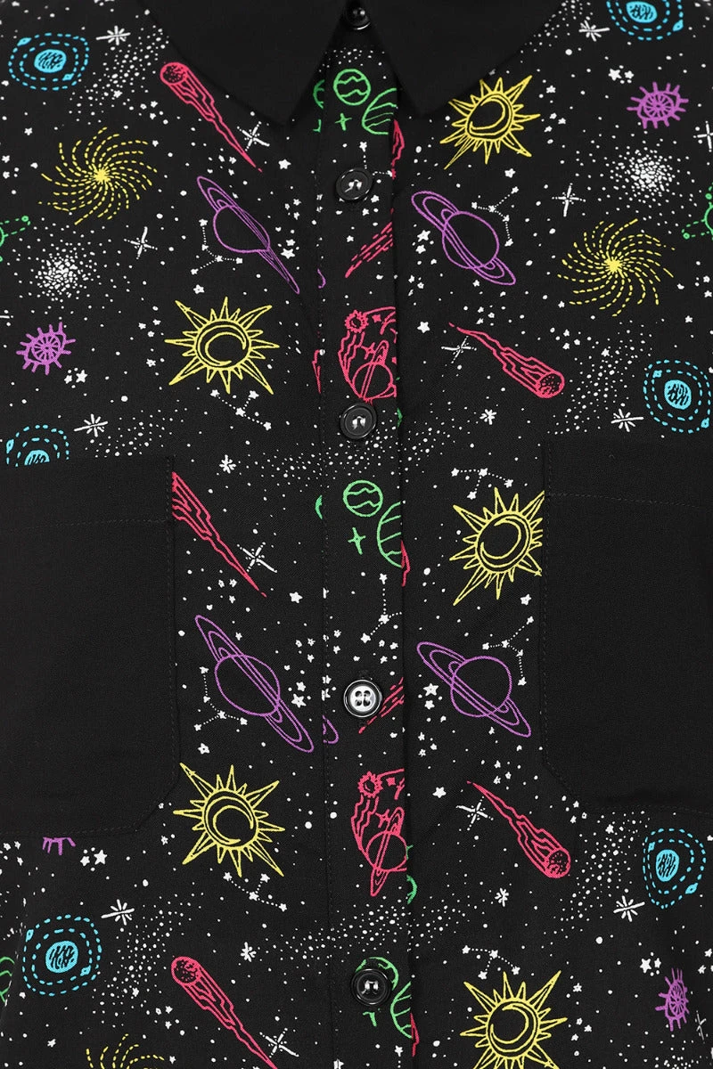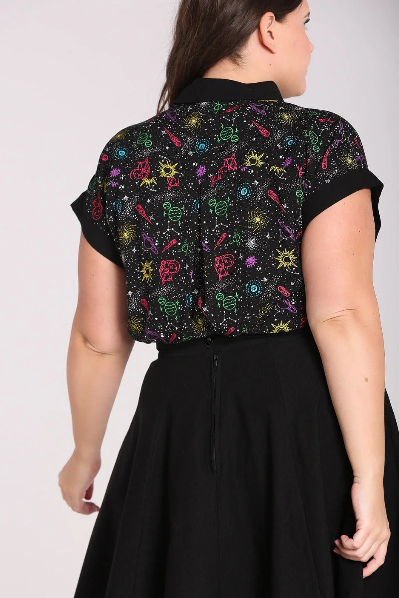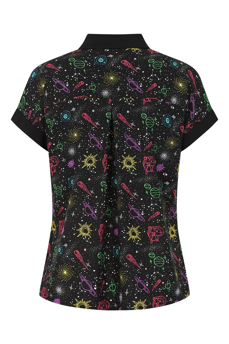 - Black base with colourful outlines of celestial motifs