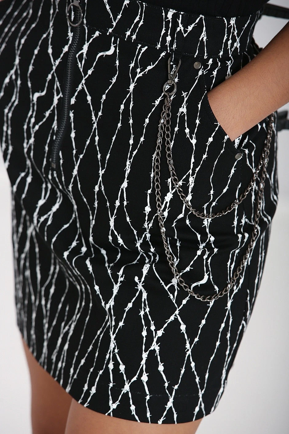 - Belt loops with gunmetal chains attached, can be removed