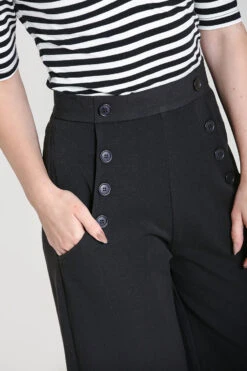 - Fake bib on front of trousers with decorative buttons along edge of pocket