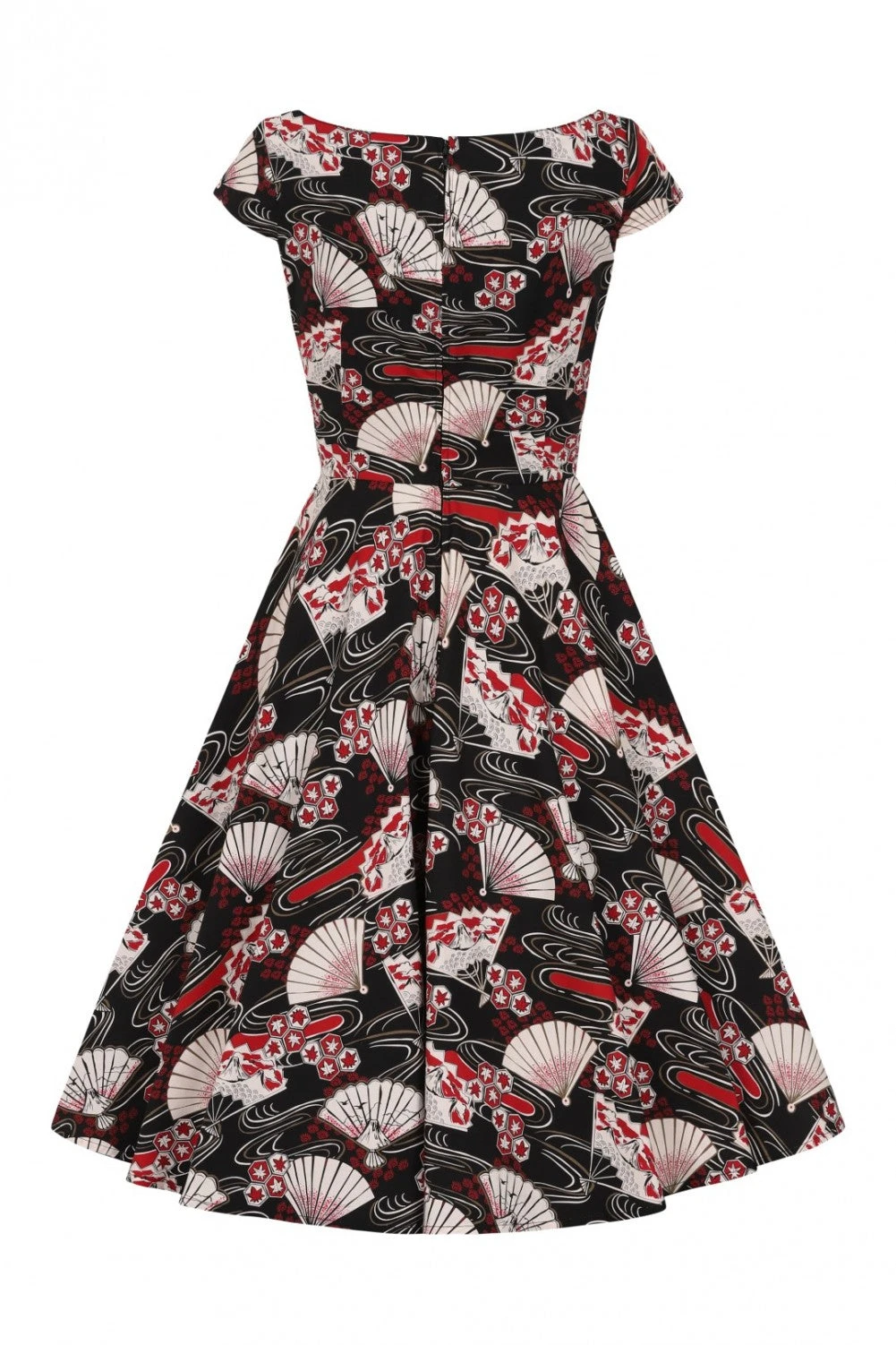 - Boat neck and cap sleeves
