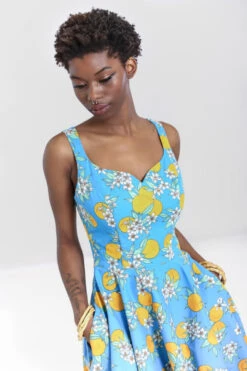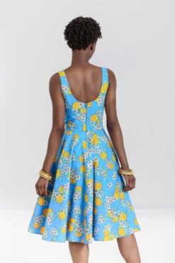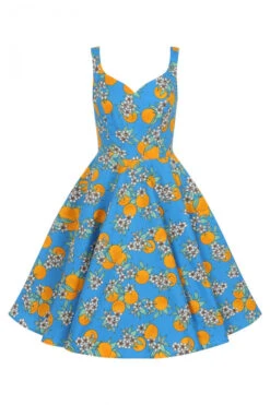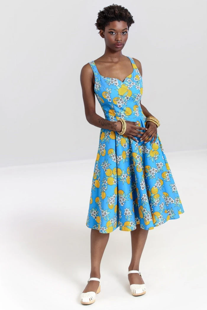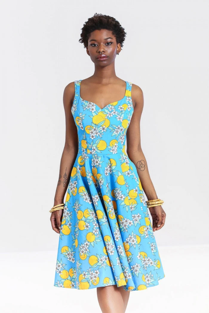 - Fitted bodice, flared skirt to below knees