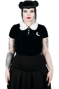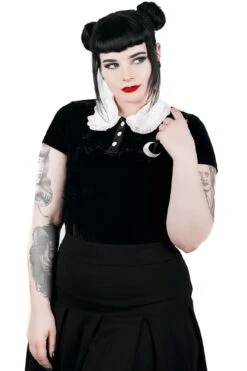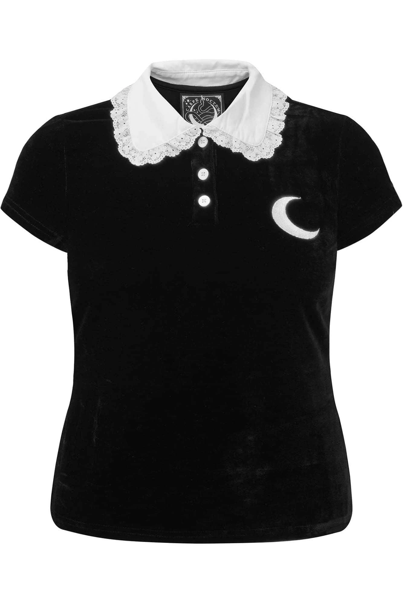Be ready for any adventure in our ‘Esmeralda’ short sleeve top; super-stretch velvet that hugs to yer body – with a high neckline and contrasting collar, short sleeves and embroidery detail. An essential piece – easy to style depending on your mood/moon!