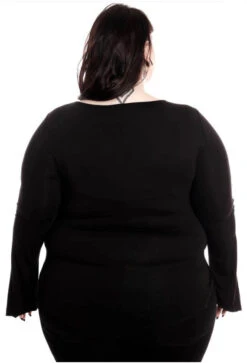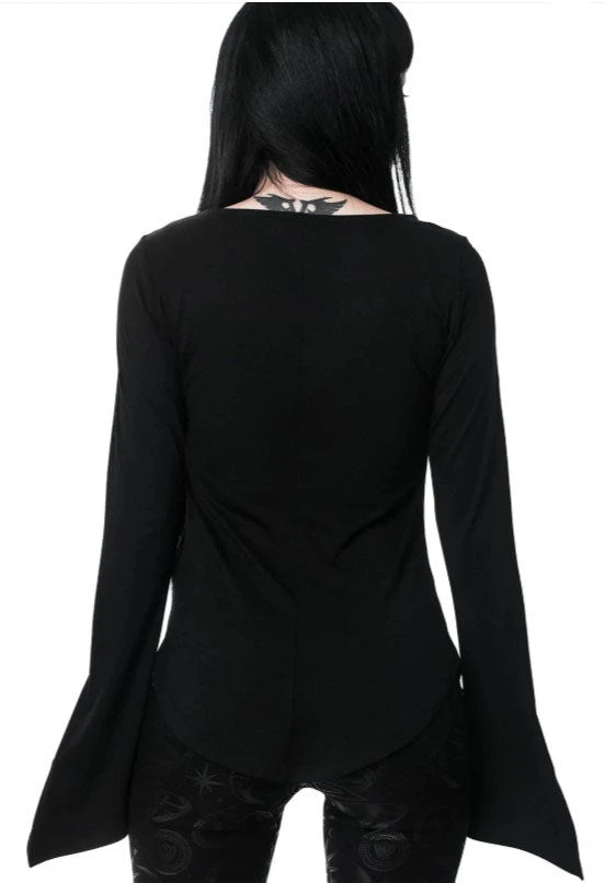 Ready to chill/thrill/kill any hour of the day with our ‘Leya’ long sleeve top. Complete in a soft-touch jersey fabric with just the right amount of stretch, round neckline, statement black-on-black print motif to the front, long bell-sleeves and rounded hem. An essential piece – easy to wear and goes with anything!