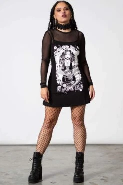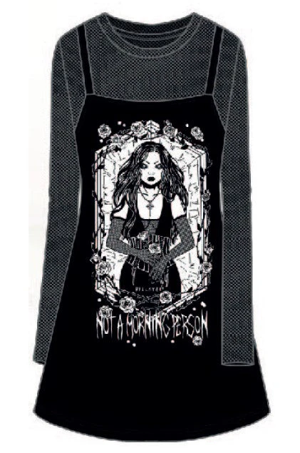 Our ‘Morning’ 2-Piece Dress has it all! Conjured from a super soft material for that ultimate comfortable yet flattering fit! Features a graphic print and thin straps over a mesh long sleeve top. A must-have piece that looks great with all your fav dark looks!