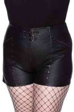 A perfect blend of naughty and nice – ‘Nemesis’ shorts. Fitted body in faux leather, with zip + buckles, zips and studs details and back pockets. Wide waistband. A perfect core piece and a must-have for your dark wardrobe!