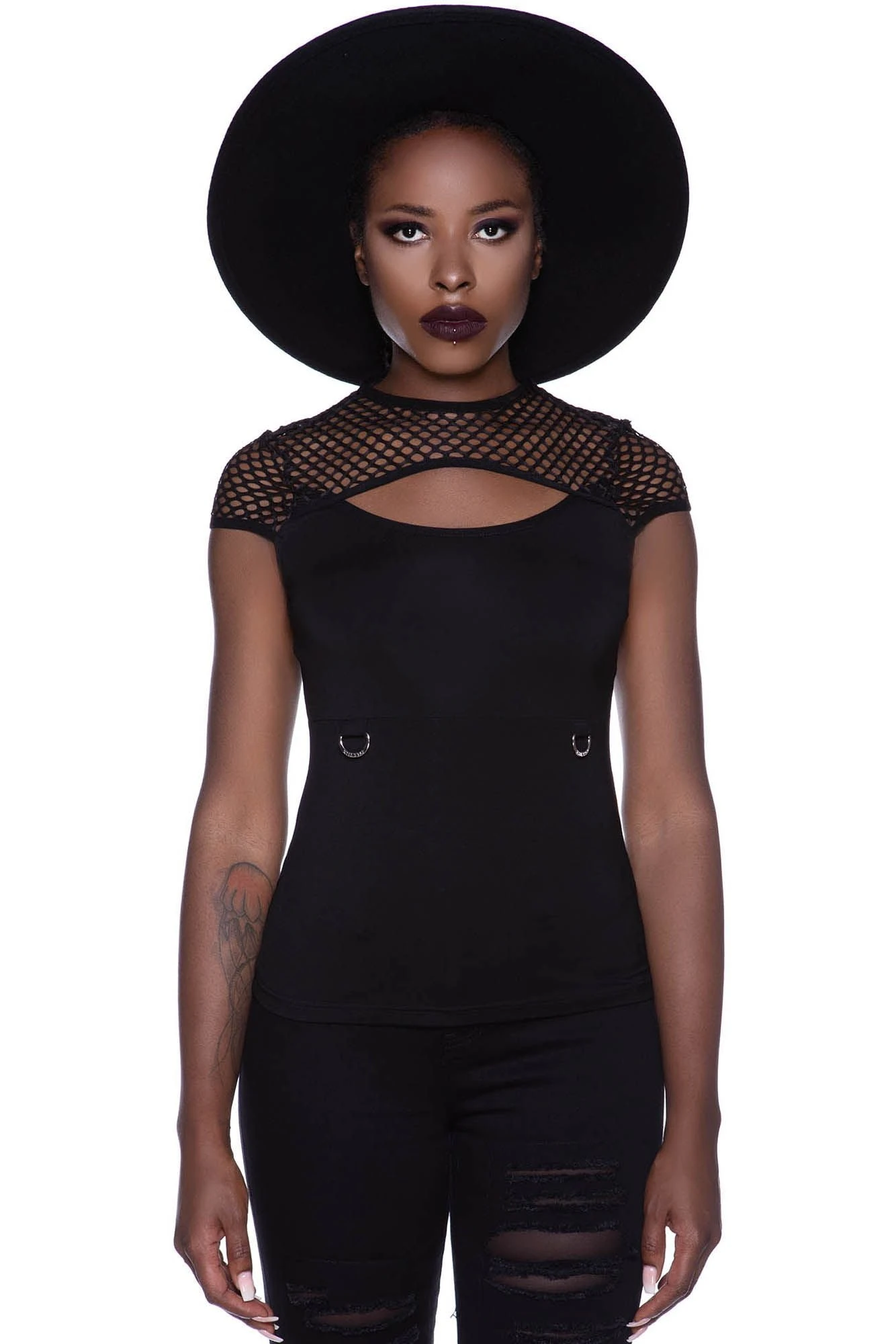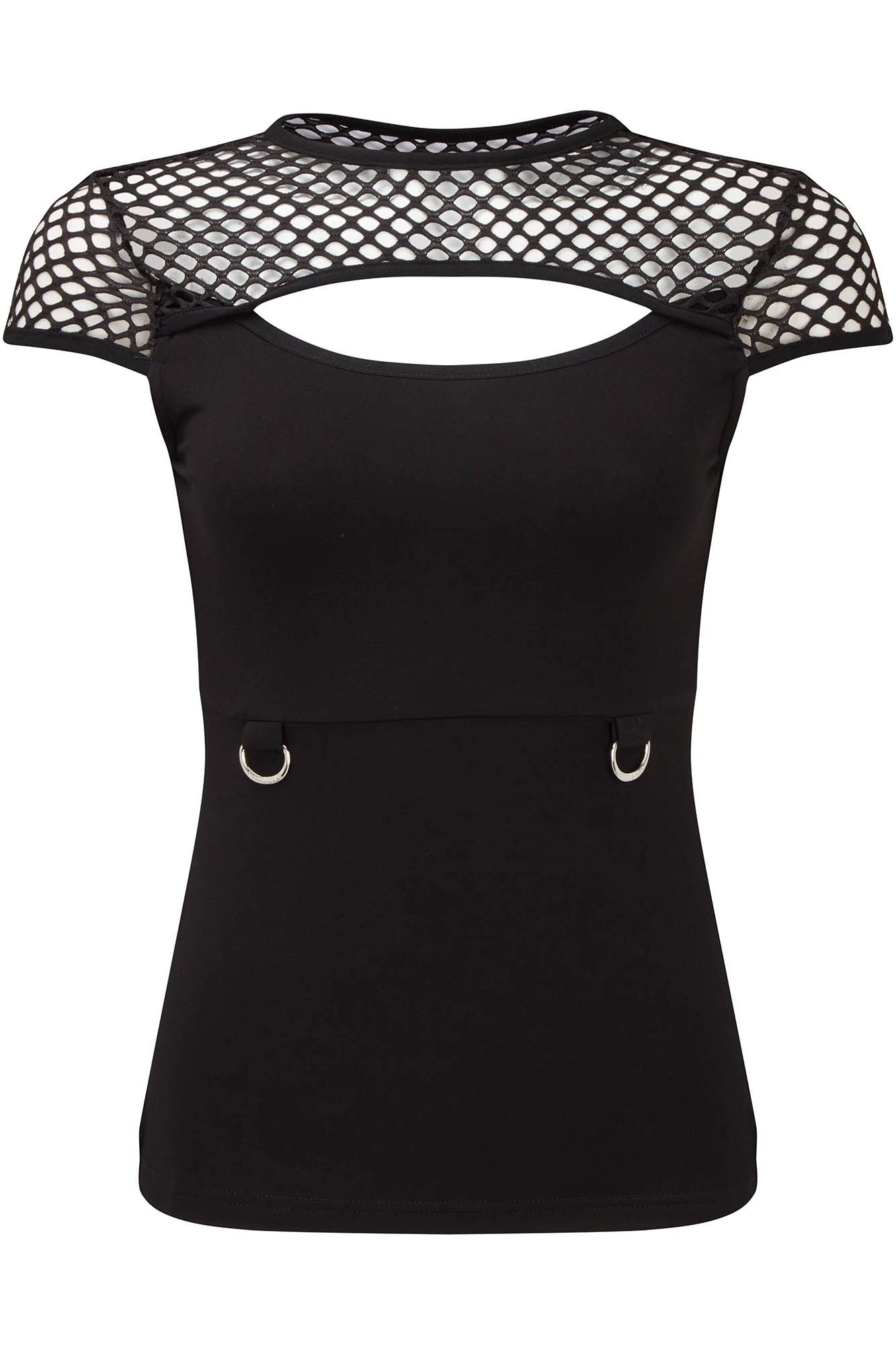 Our not-so-basic basics; the ‘Ramona’ cap-sleeve top is the oh-so-versatile piece you need in yer dark life. Made using a super-stretch jersey and fishnet which stretches to perfection for a flattering yet comfortable fit. Complete with a high neckline, fishnet yoke and d-ring detail. A perfect wardrobe staple that can be dressed up or down as your dark heart desires!