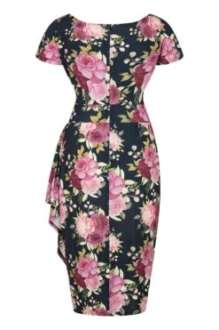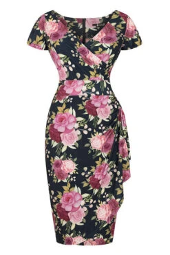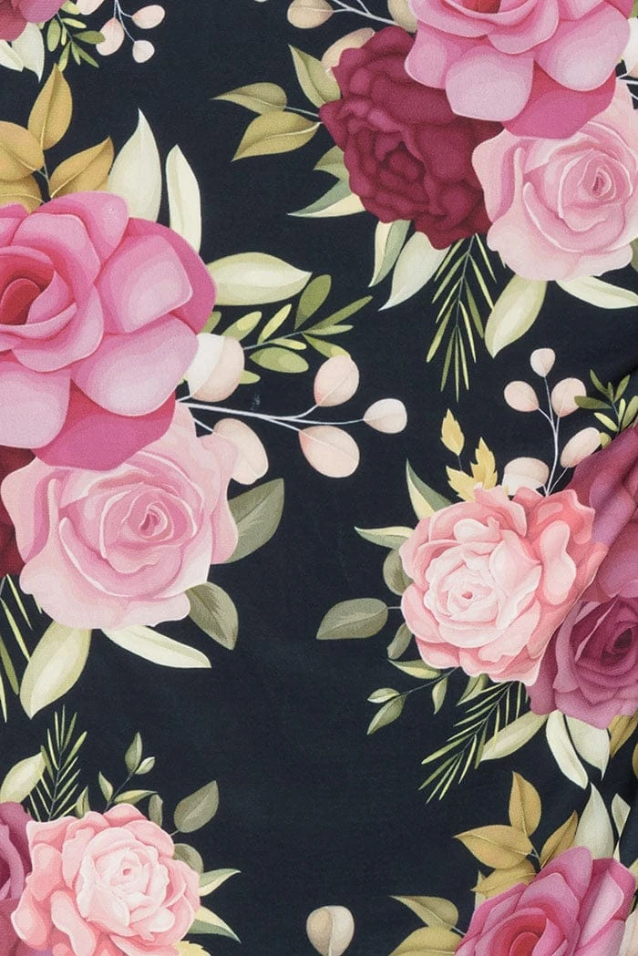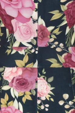 - Print features a rose print in mainly pinks and greens on a navy blue background.