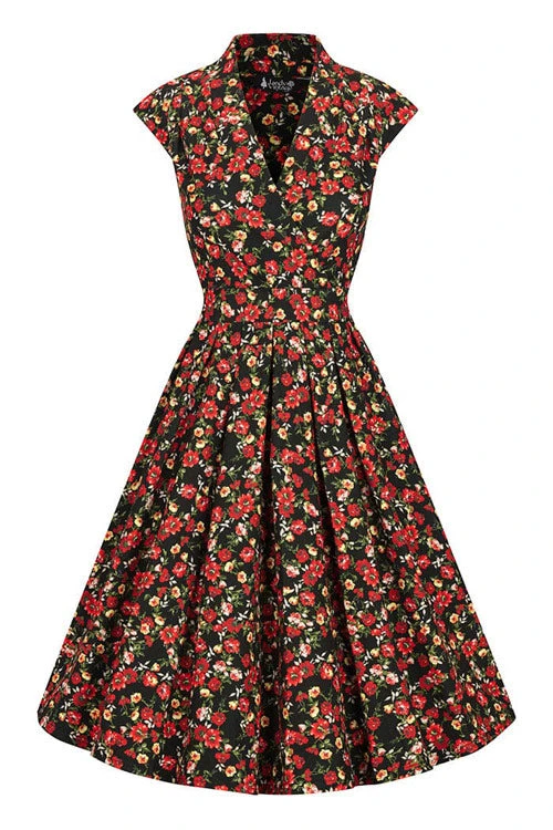 - Print features a ditsy floral print in mainly red on a black background.
