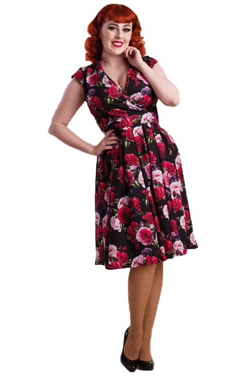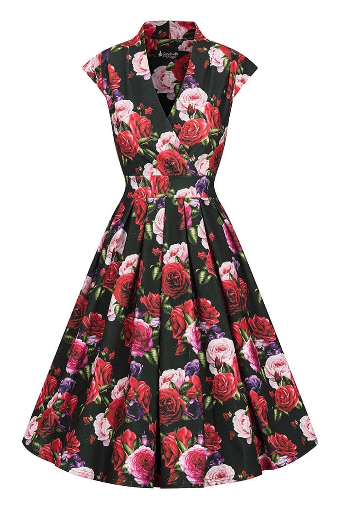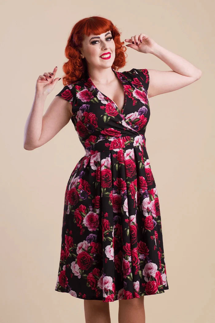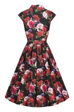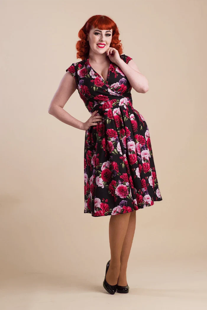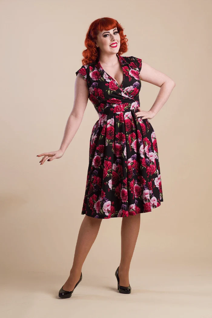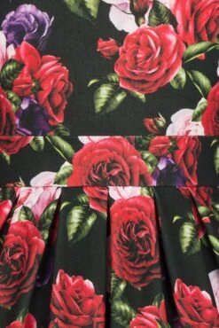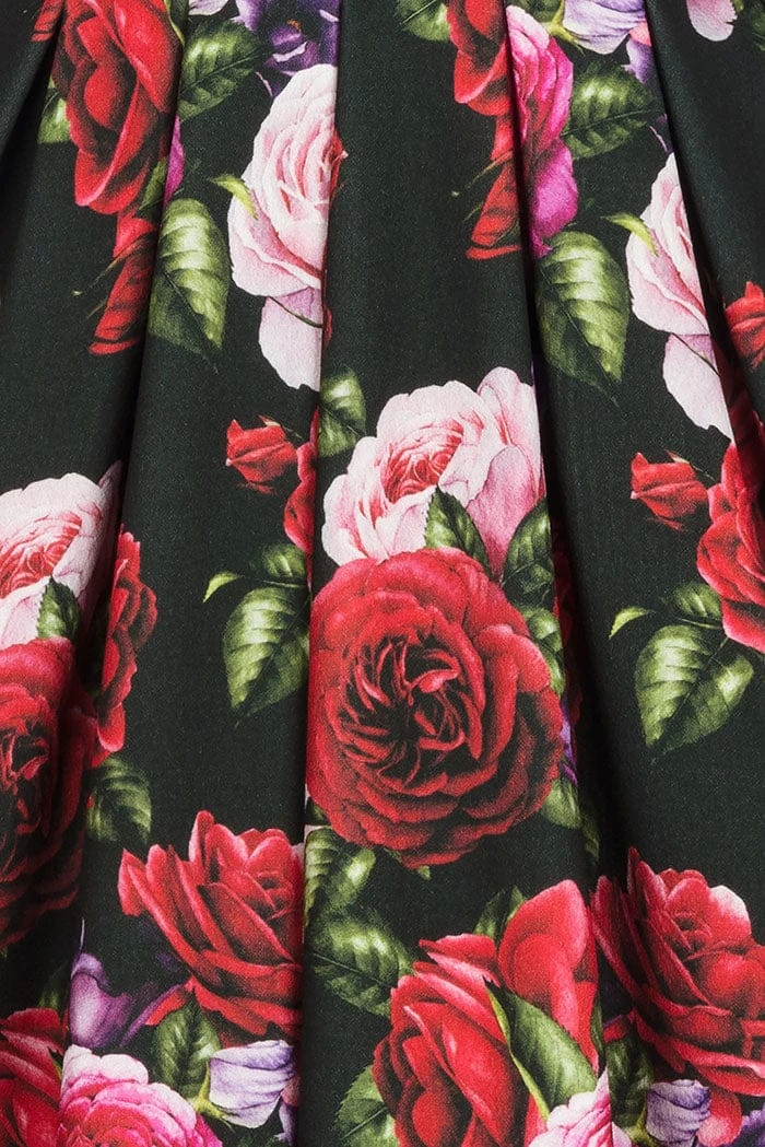 - Print features a Rose print in mainly Red, Pink and Purple on a Black background.