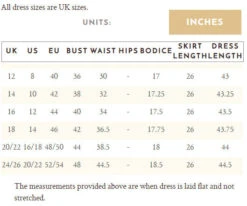 UK10, UK12, UK14, UK16, UK18, UK20/22, UK24/26, UK28/30
