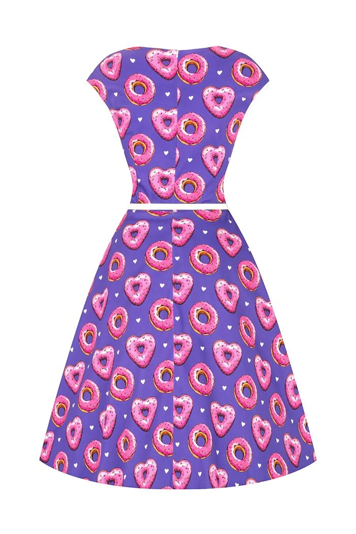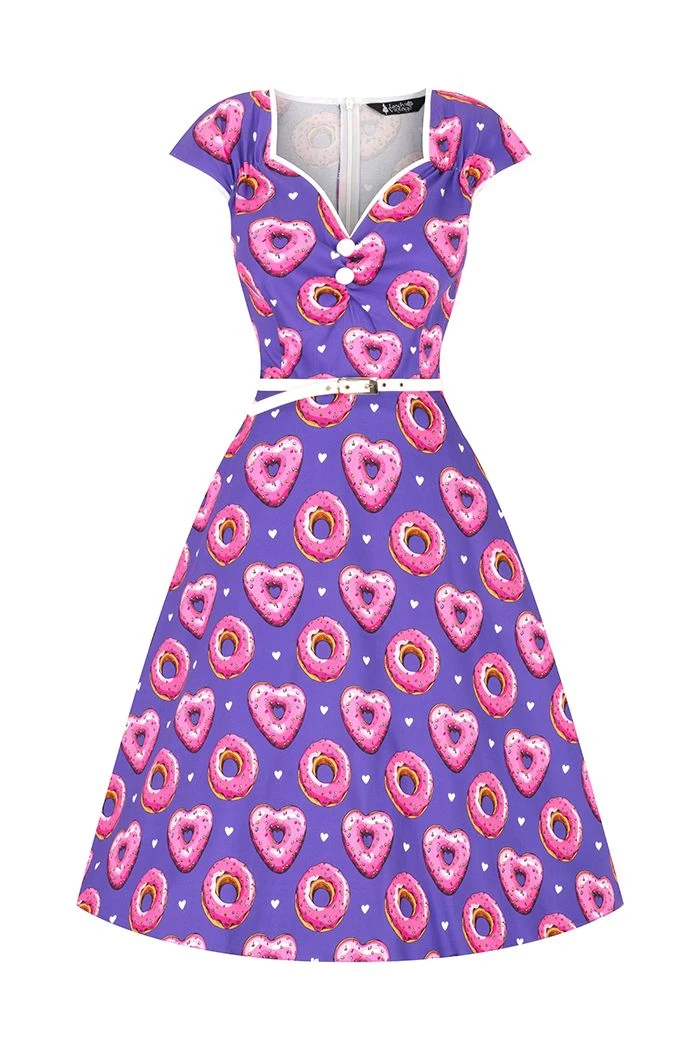 The Isabella dress is presented in sweet patterns. Casual offices and girly brunches are great places for this fun frock! Short cap sleeves and a sweetheart neckline create an adorable mood. Its contrast edging detail and large buttons add youthful touches. The flared skirt falls below the knee in a classic ’50’s shape.