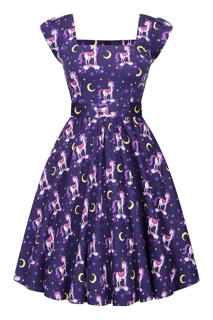 Lady V’s Swing dress offers a square neck, gathered cap sleeves and a fitted waist with a soft belt combine for a cute ’50’s mood. Gathers create a full, flared hem, finishing at the knee for an instantly recognisable vintage aesthetic