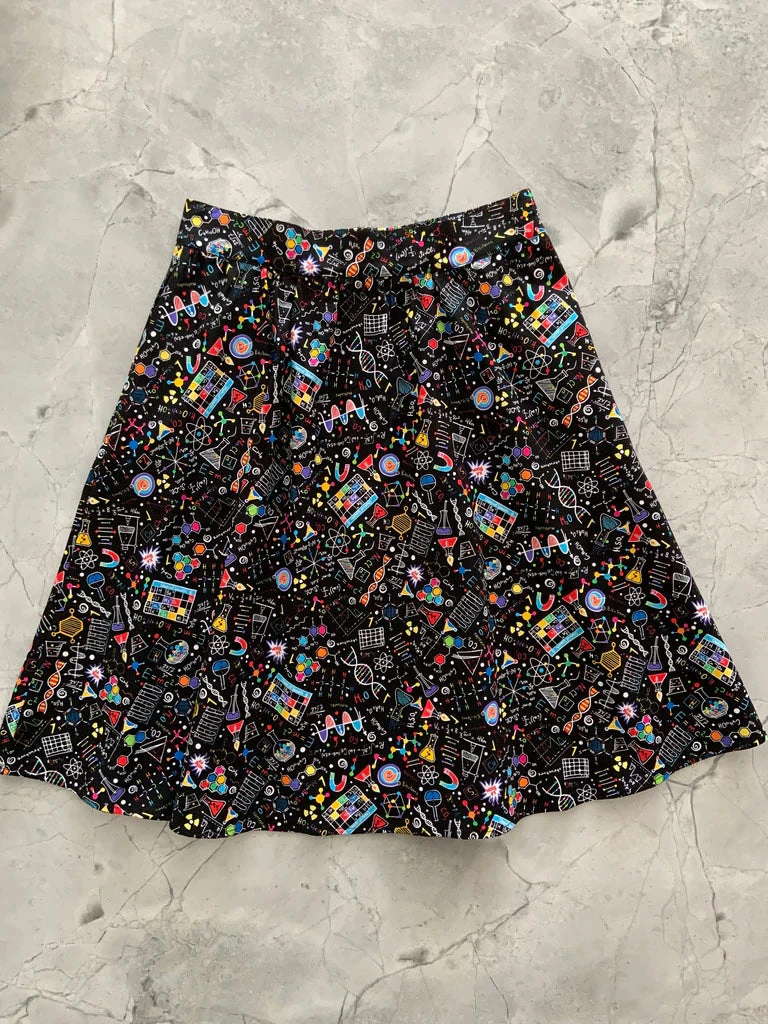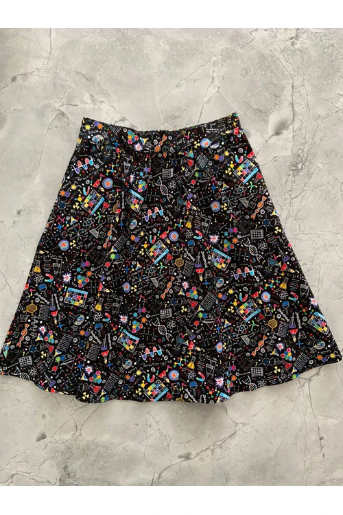 For the love of science, this skirt is a great addition to your Smart Girl style! Shown in a colorful science print, this retro-inspired skirt features an elasticized back waistband for ease of comfort, a slightly gathered skirt equipped with hidden side pockets, and a back zippered closure.