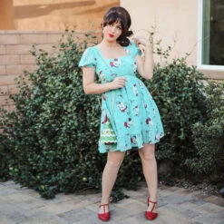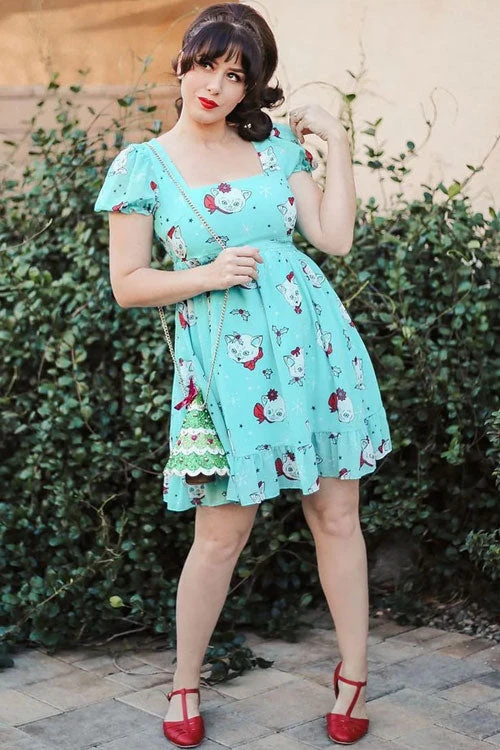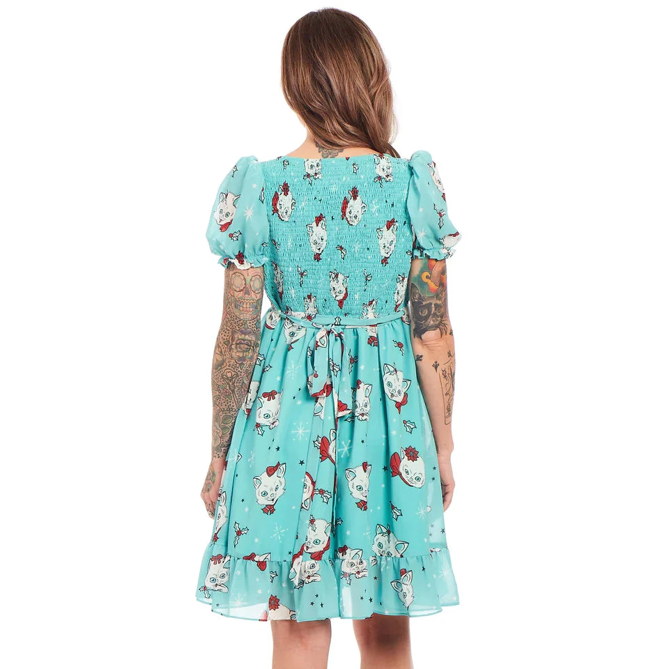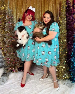 The new Christmas Kitties Cream Puff dress is the most purrrrrfect dress that you ever did see! This adorable mint-colored dress features Sourpuss’s beloved Christmas Kitties art, with white chonky cat faces, holly, and stars! The sleeves have elastic so they’re comfortable and flattering, and the back of the bodice is fully smocked so there is a lot of stretch. It also comes with a detachable sash that can be tied in the front or back!