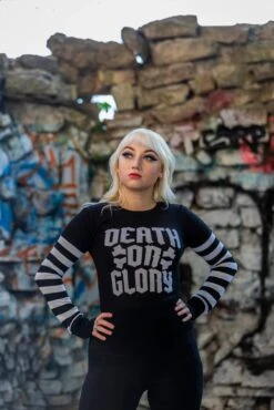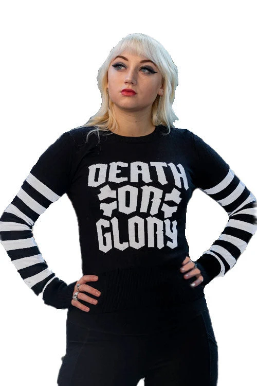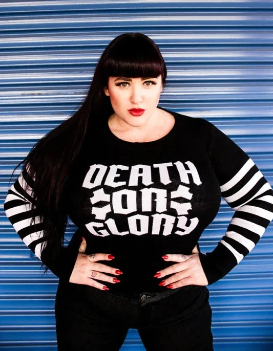 It’s made from a super soft and stretchy viscose yarn, that is so cozy you’ll never want to take it off. The vibrant black and white “Death or Glory” artwork is knitted into the sweater, as well as the sleeve stripes.