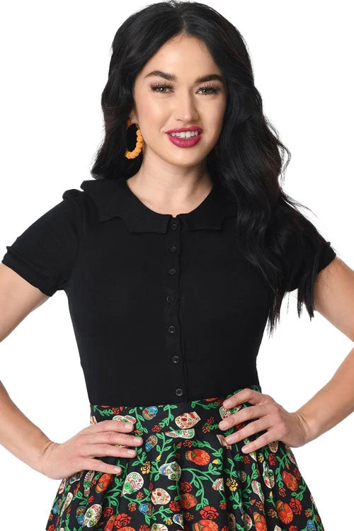 This gorgeous bat inspired button up blouse with bat wing collar is just the thing you need for any gothic wardrobe.  The short sleeves have a button cuff which can be left open if you prefer your cuffs wider.  The stretchy fabric means that you can wear it snug without feeling uncomfortable.