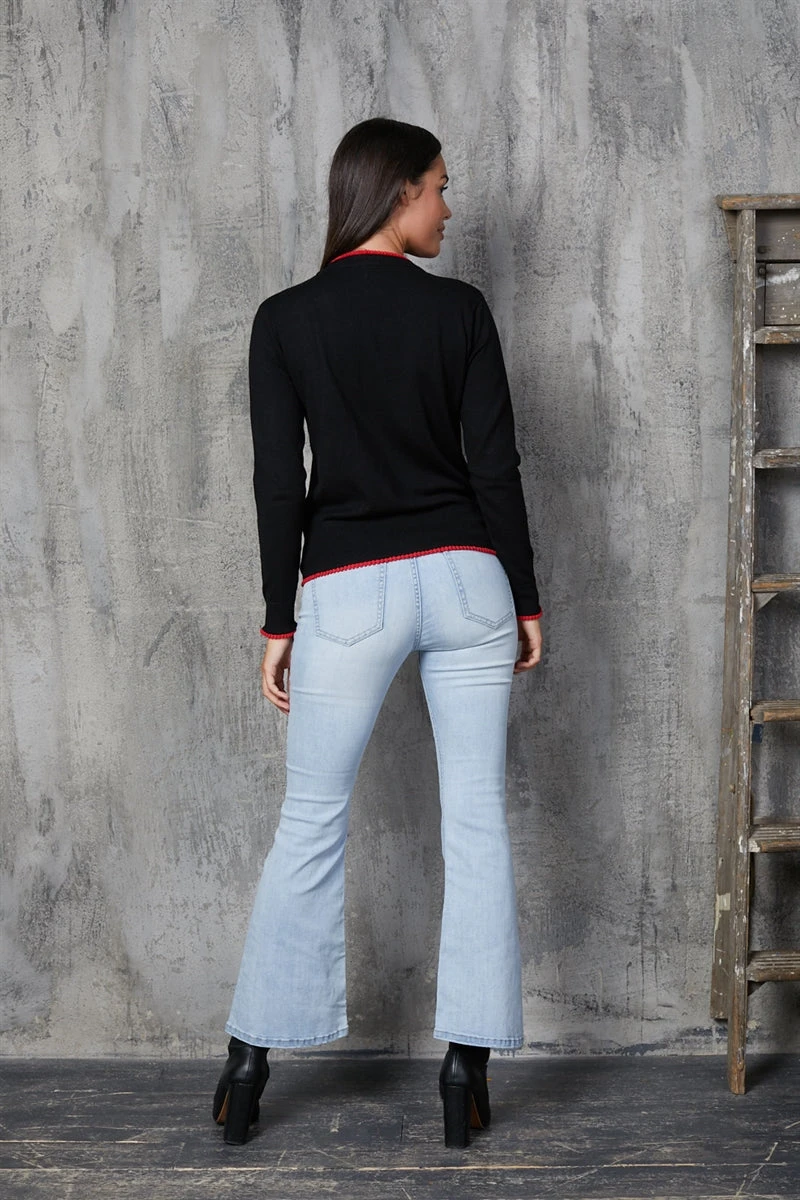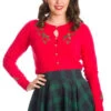 This delicate long sleeved knitted a cardigan is a staple piece for all Vintage inspired wardrobes, the perfect finishing touch to any outfit. This black ribbed cardigan features a multicoloured floral embroidered design at the front, a five button down front which is highlighted with a red embroidered hem. A wide V-neck is flattering and ribbing at the cuffs and bodice hem. The relaxed fit makes it a perfect piece to be worn alone, and teamed with high waisted jeans. This style also looks fabulous worn open to show of your fabulous 50’s flared or pencil dress!