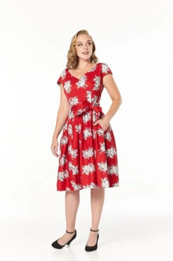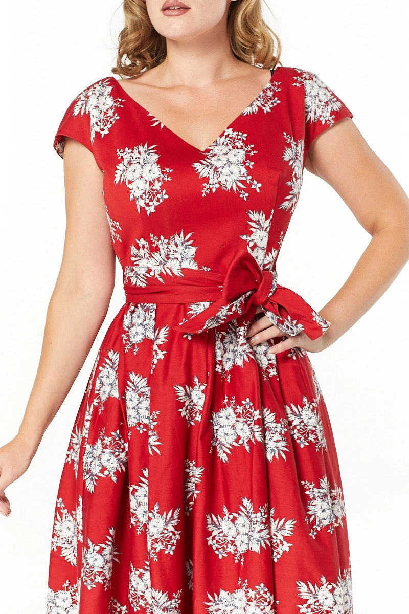 Celebrate colour in your wardrobe with this 50s Haisley Floral Swing Dress in Red! This vintage gem features a beautiful V-neckline, cap sleeves, fixed tie straps at the waist and flows into a pleated swing skirt for that real feminine fifties look
